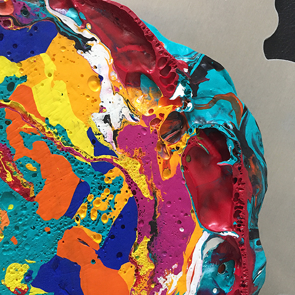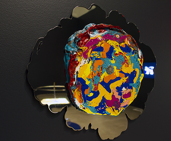 In Cosmic Crucibles, sliced acrylic paint represents thermonuclear forces in an exploding star. The acrylic is