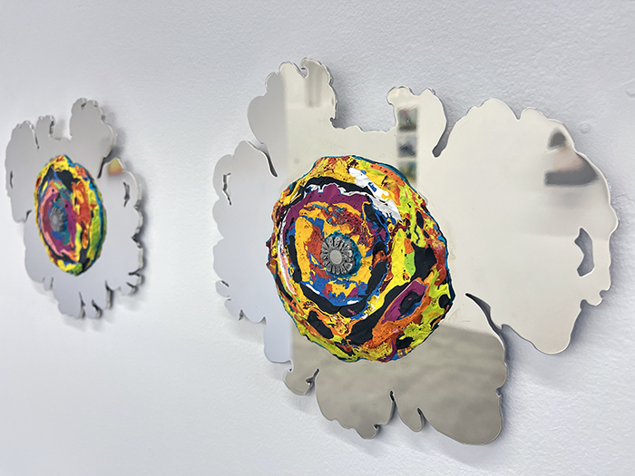 In Cosmic Crucibles, sliced acrylic paint represents thermonuclear forces in an exploding star. The acrylic is